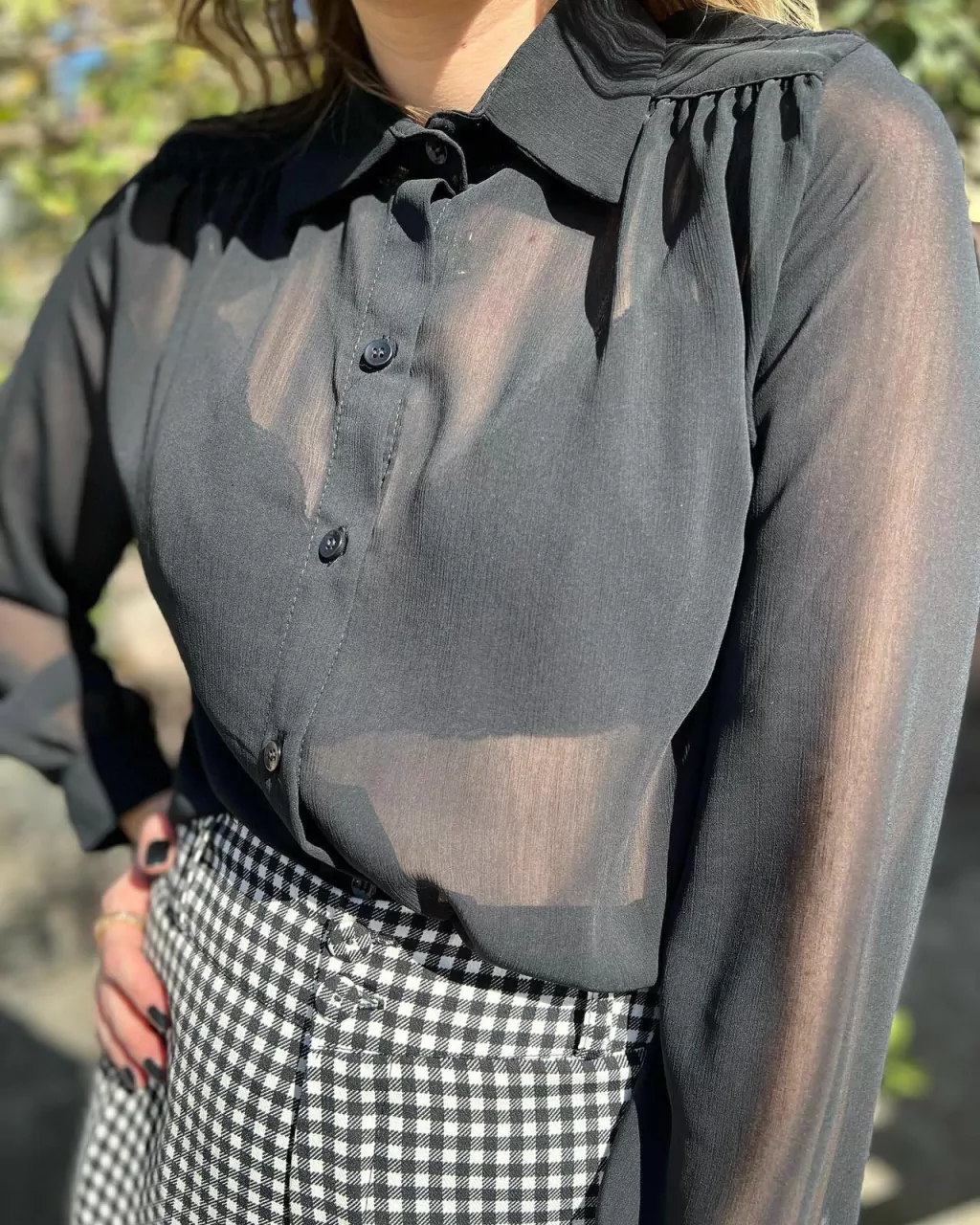Camisa em tecido leve com toque sedoso e transparência. Possui costura italiana que traz ainda mais requinte a peça.