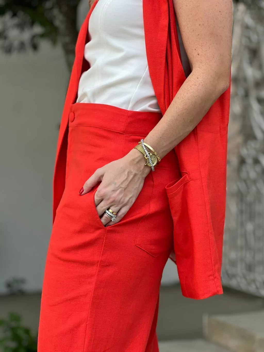 Maxi Colete Feminino produzido em linho com viscose, um tecido estruturado com caimento elegante.