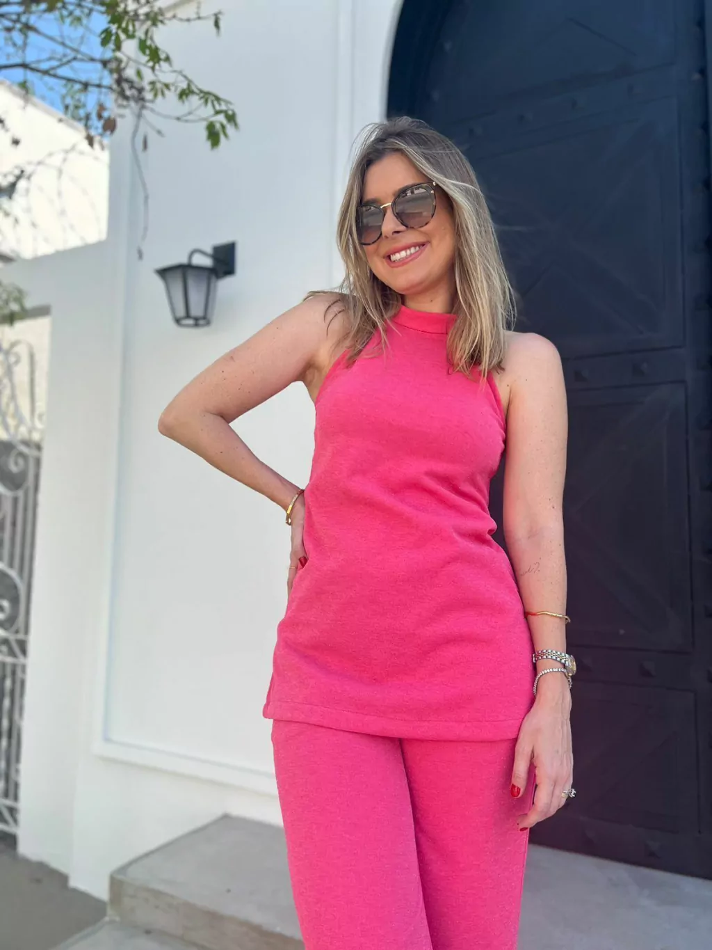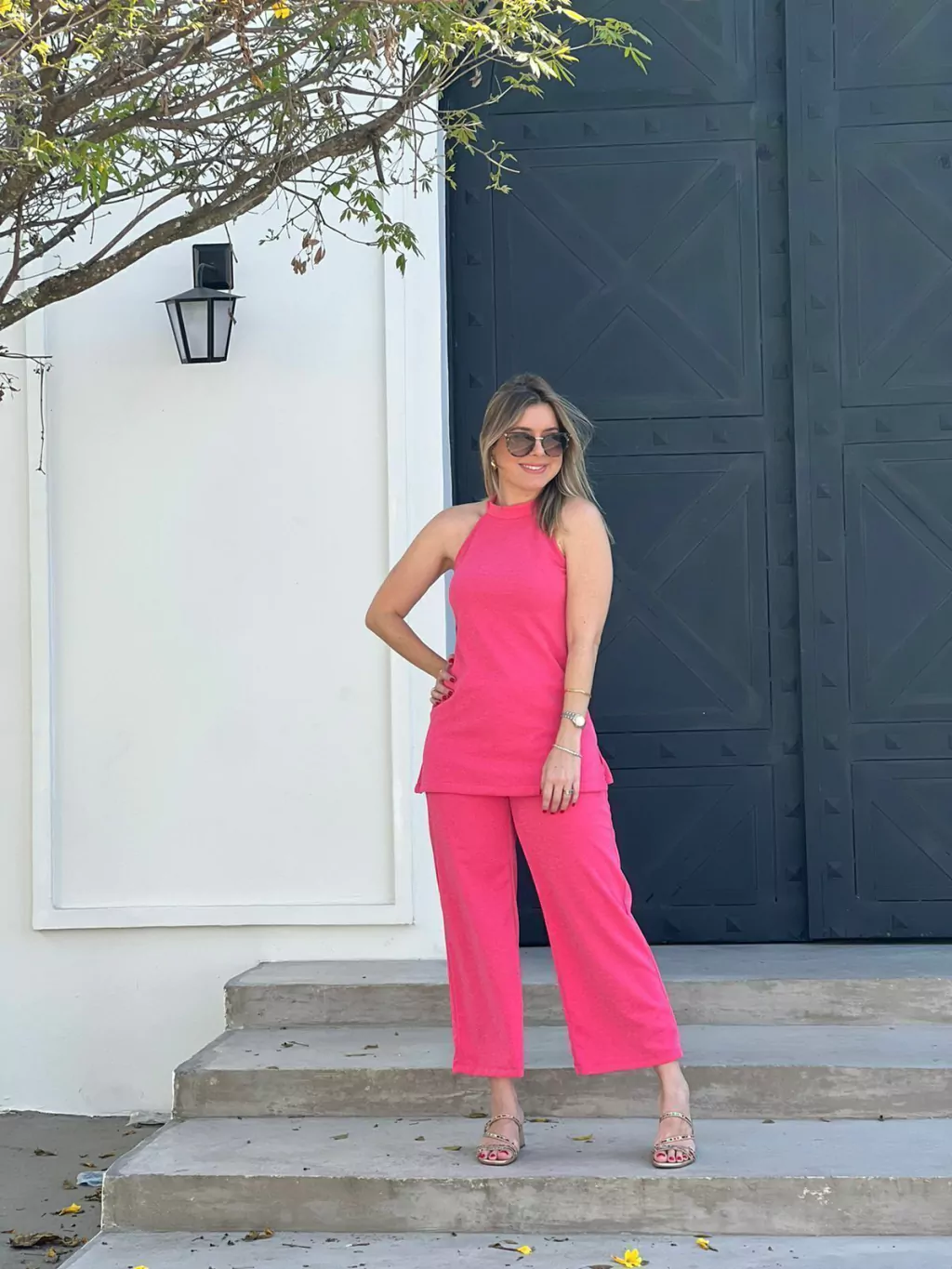 Conjunto de Blusa frente única e Calça Pantacurt em malha Lurex.