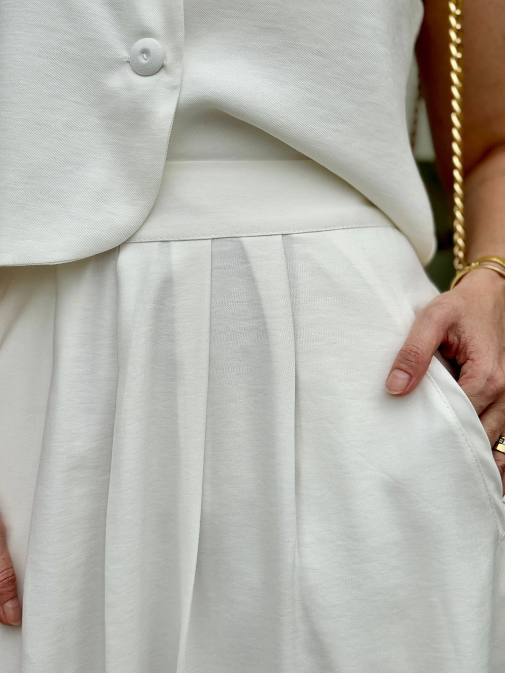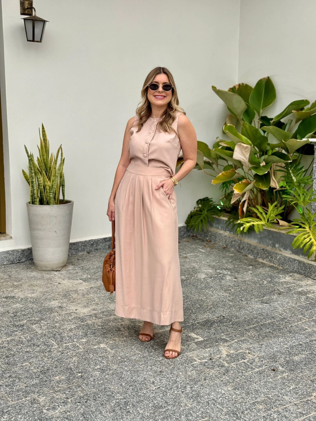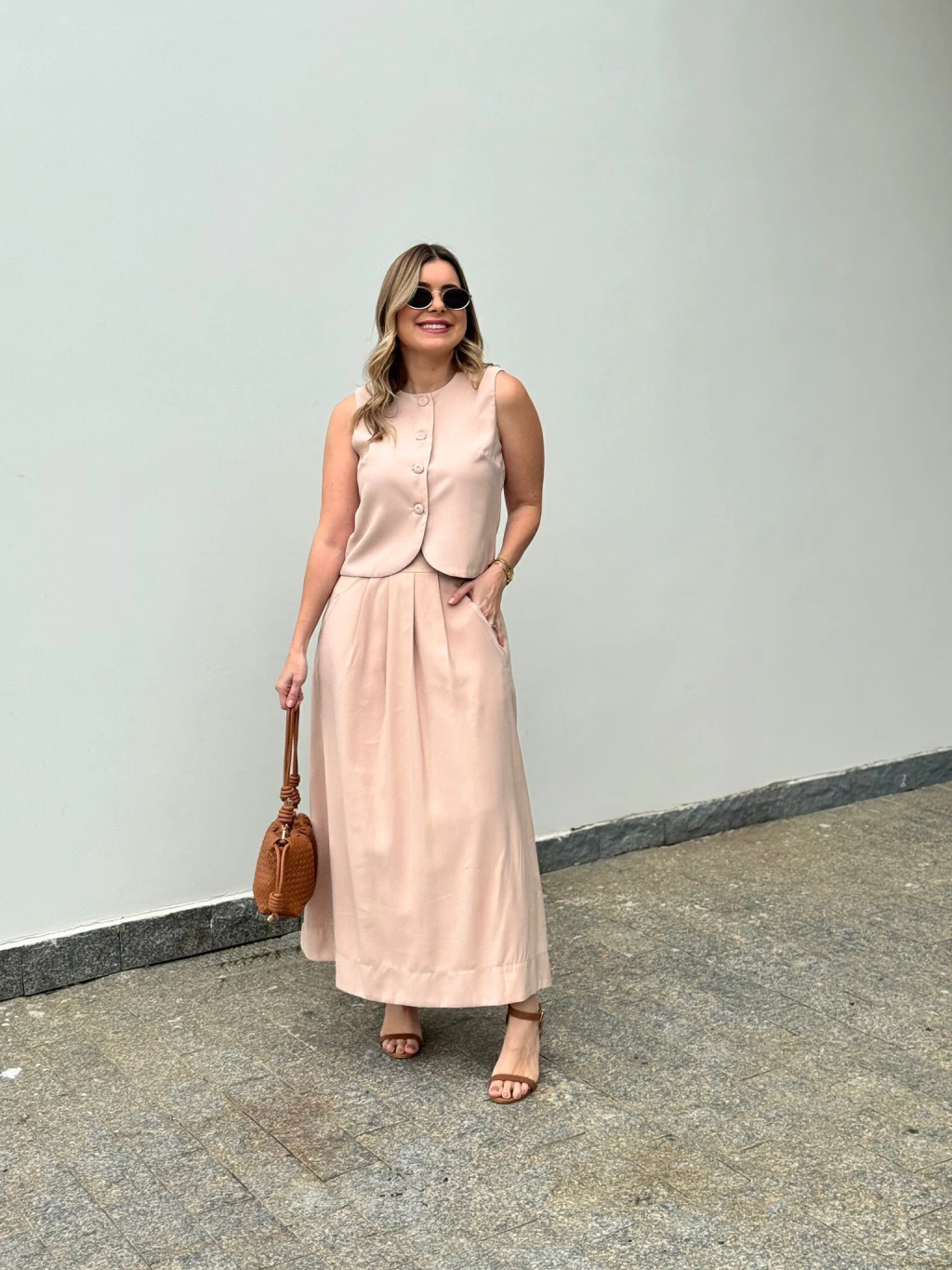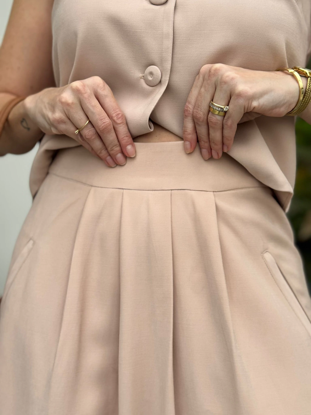 A Saia Alice é sinônimo de elegância e movimento. Com cintura levemente alta e pregas delicadas que proporcionam fluidez, a peça valoriza a silhueta com um toque clássico e feminino.