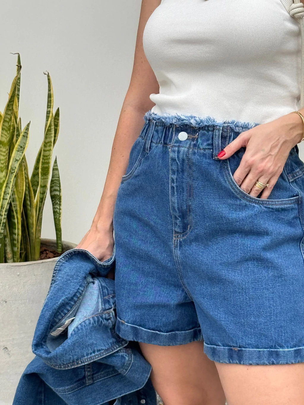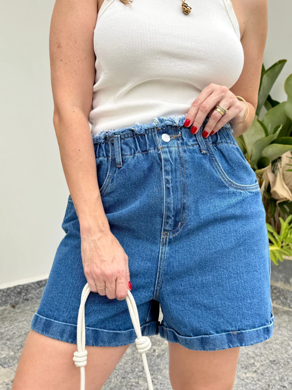 ✔ Cós alto com elástico e acabamento desfiado