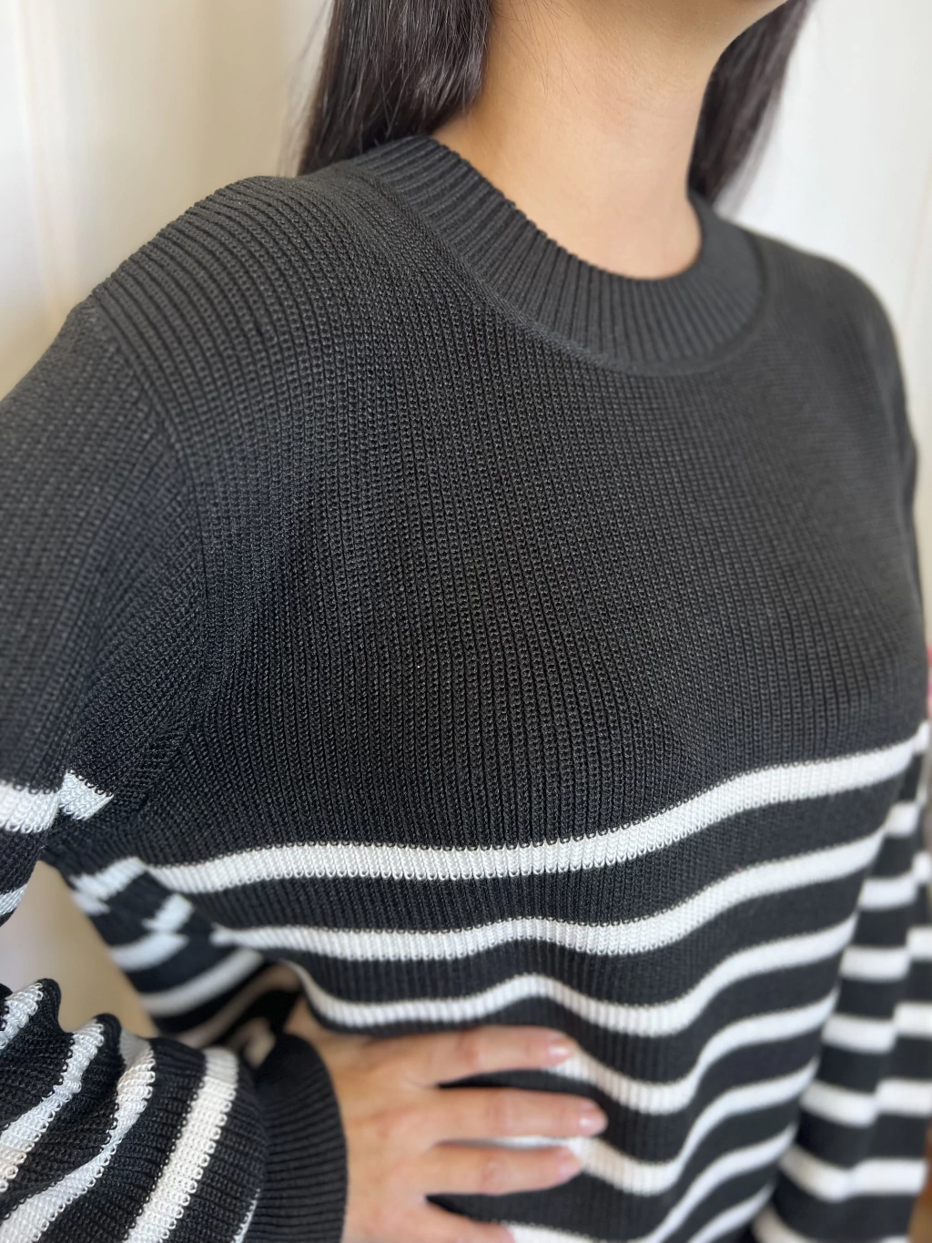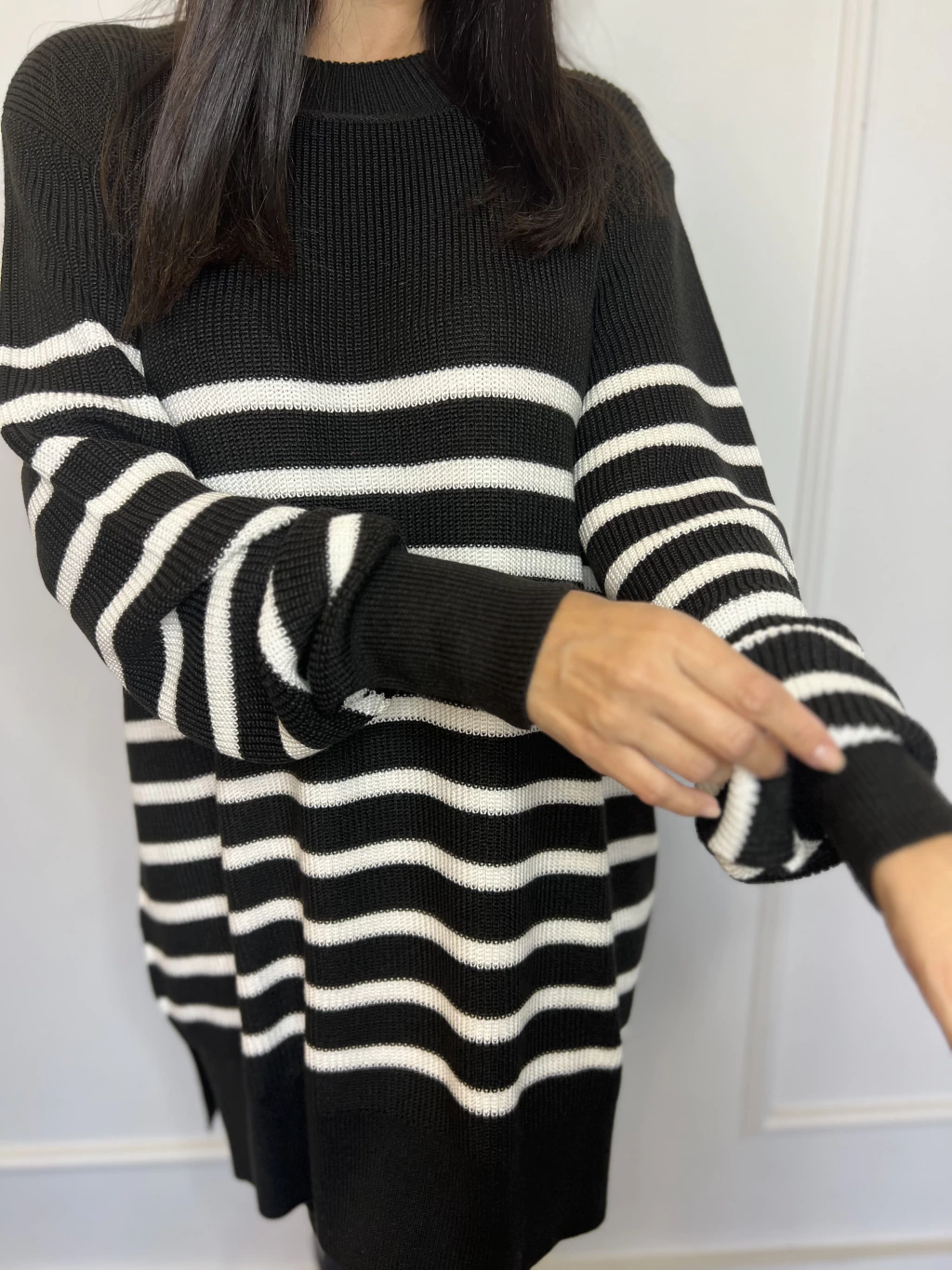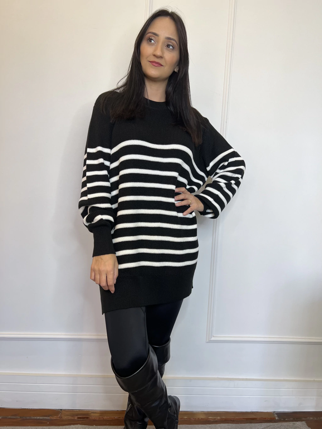 O nosso Tricot Giliane listrado é um clássico atemporal, possui modelagem ampla e trama leve. Suéter de gola redonda e manga comprida, parte inferior com aberturas laterais e acabamento canelado, com padronagem listrada com cor contrastante. Perfeito para deixar seus looks de inverno ainda mais estilosos.